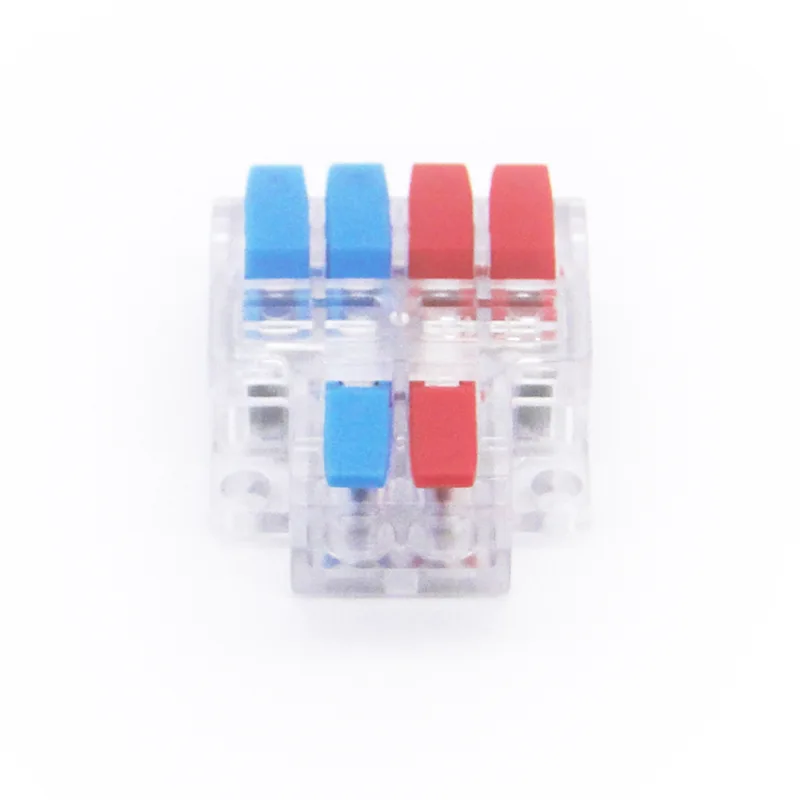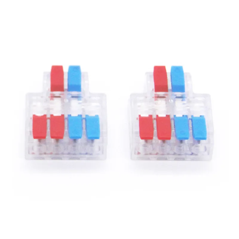 İki girişli, dört çıkışlı ekleme telli hızlı konnektörler, 6 milimetre kareye kadar bağlantıları destekleyen büyük çaplı kablolar için tasarlanmıştır. 35 ampere kadar akımları kaldırabilir. Kablolama yollarını açıkça ayırt etmek için farklı renkteki tutacakları kullanıyorlar.